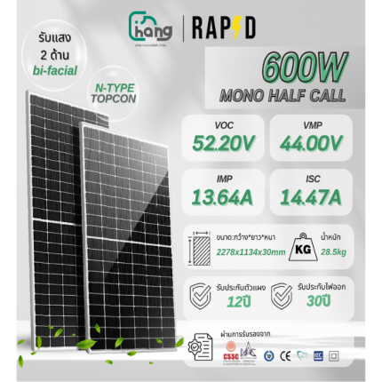 Rapd แผงโซล่าเซลล์ N-type 600W Bifacial รับแสง2ด้าน